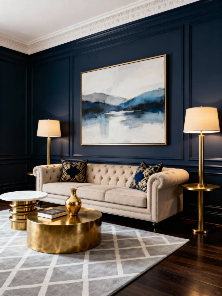 Picture this: a wall so rich and moody it feels like a warm hug after a long day. Deep navy blue brings sophistication and coziness in one swoop. It’s a total vibe with metallics (gold lamps, anyone?) or natural wood tones.