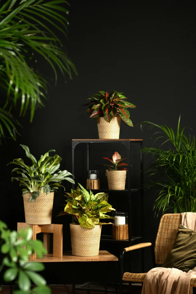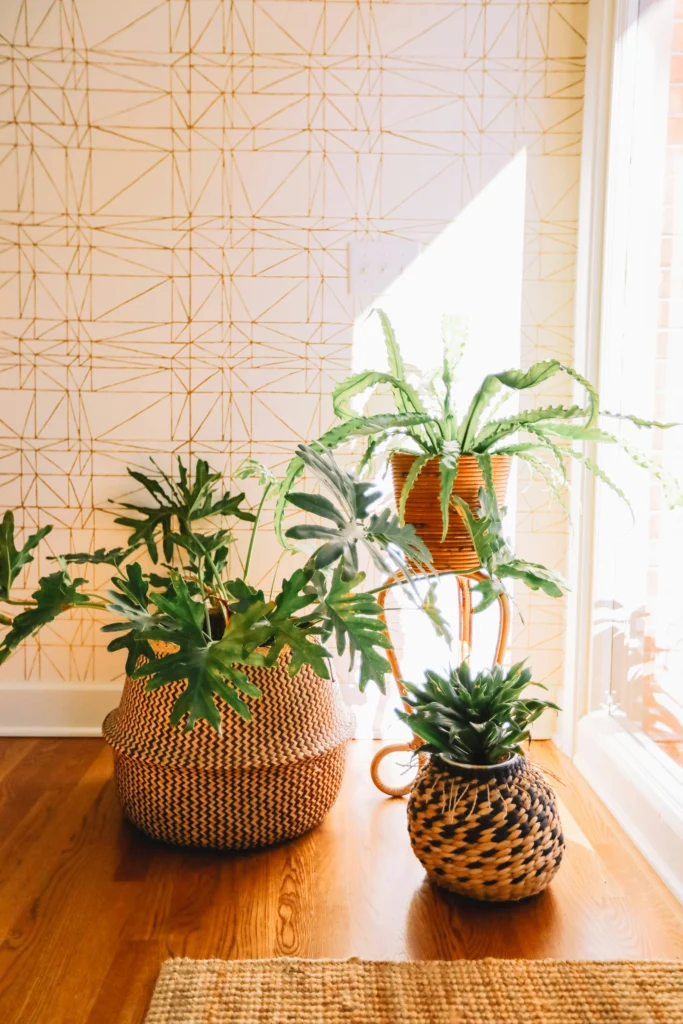 you can totally use woven stands and rattan furniture for a relaxed, natural feel. Placing a leafy fern on a vintage-style rattan stool gives it the perfect boost toward the sunlight. It feels incredibly cohesive with the larger floor baskets and brings a warm, organic texture to your carefully curated space.