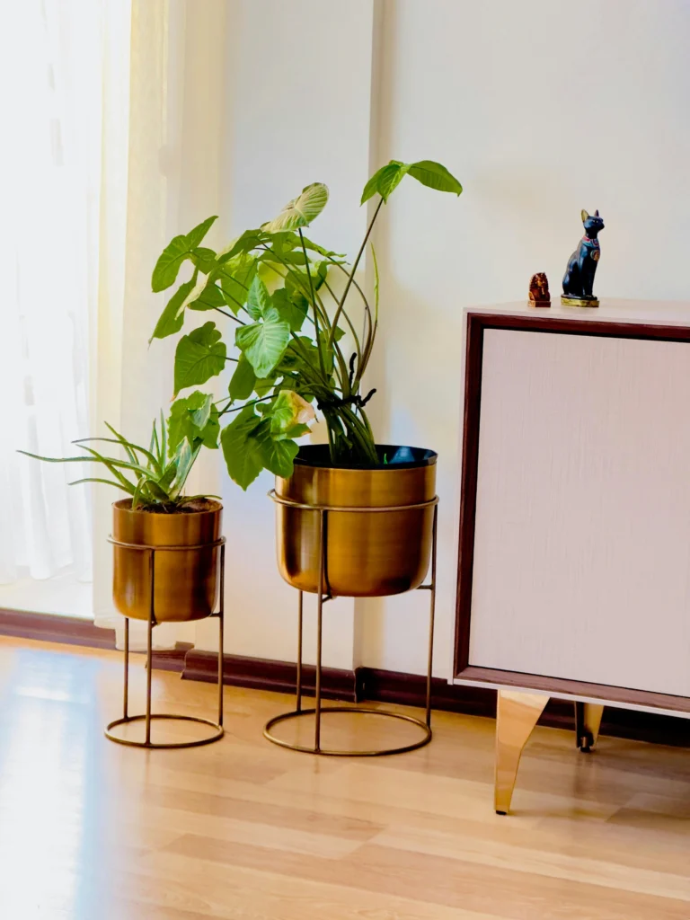 nothing says polished elegance quite like brushed brass. These matching gold-toned stands add a touch of intentional luxury to your everyday houseplants. They tie in perfectly with the metallic accents on nearby furniture, proving that plant displays can be a cohesive part of your room’s overarching palette.