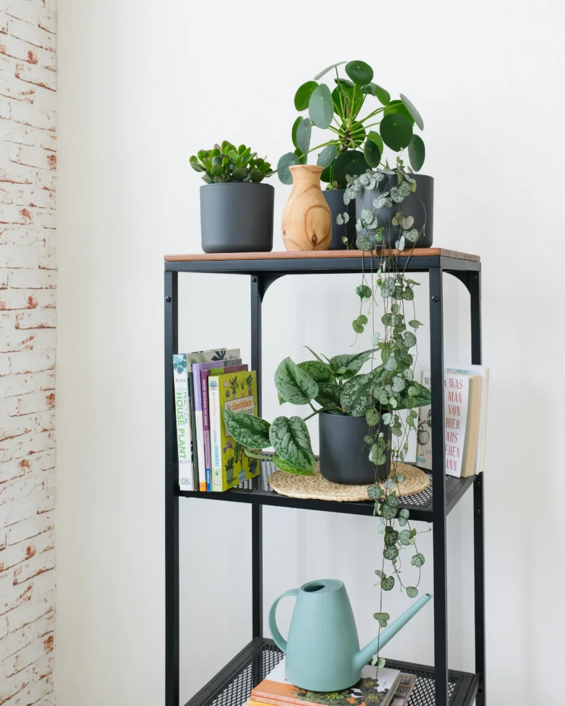going vertical is a total game-changer for small spaces! A tall, open-frame shelf lets trailing vines cascade beautifully. I love how the simple, functional decor—like a pastel watering can and a few colorful books—adds authentic character. Keeping the arrangement airy allows each little leaf and item to stand out wonderfully.