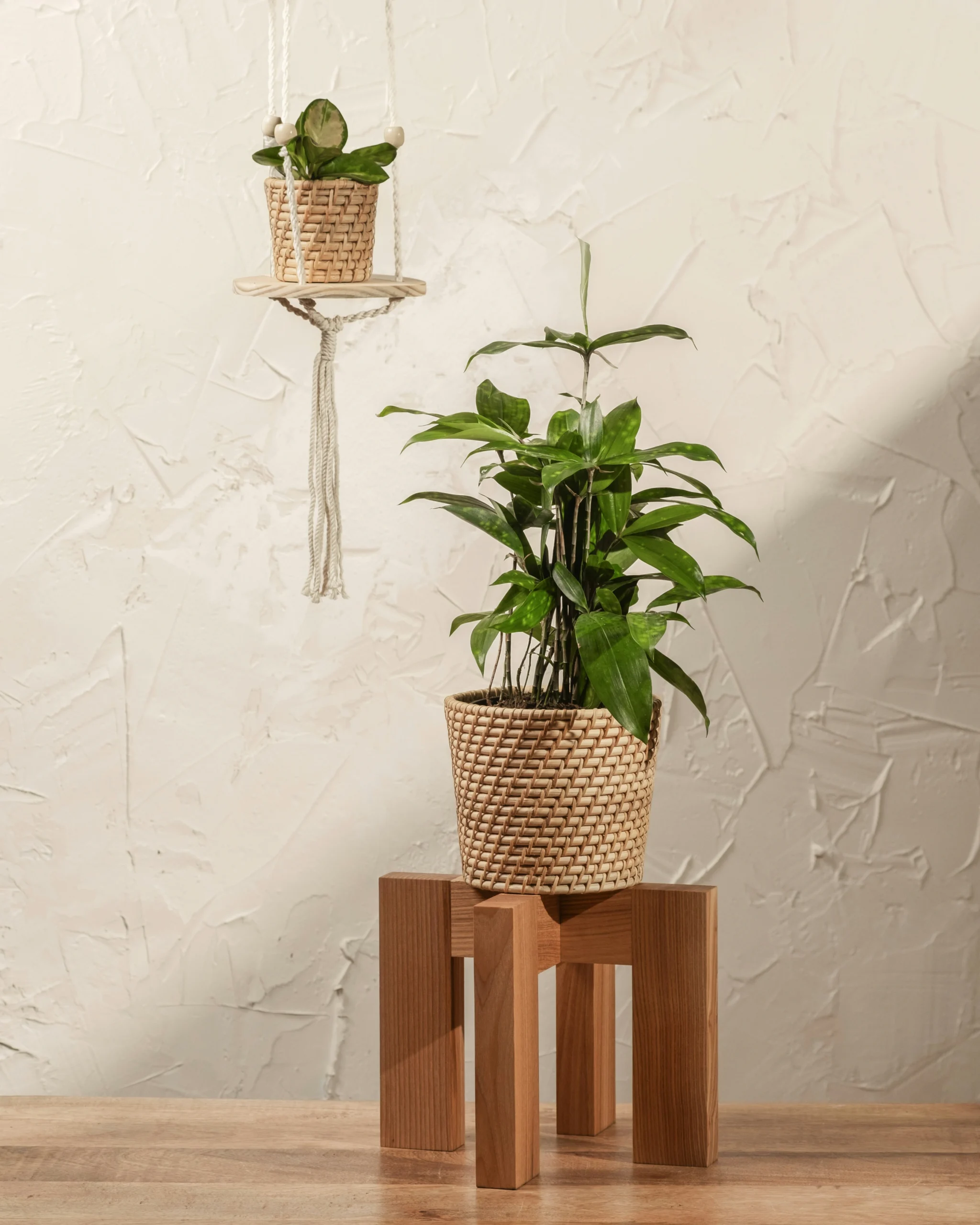 sometimes less really is more. A simple, interlocking wooden stand brings an earthy warmth that pairs beautifully with a textured, two-toned pot. It elevates your plant just enough to make a subtle statement without overpowering the room. This kind of intentional decor feels authentic and keeps the floor looking clean and spacious.