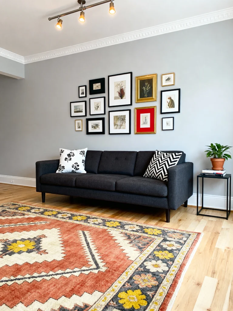 Art lovers, this one’s yours. Hang a black-framed gallery wall—mix photos, prints, whatever—against a light grey backdrop. Add a black sofa to anchor it all. It’s artsy, it’s personal, and it’s a total flex. I tried this with some thrift store frames—suddenly my living room felt like a museum. (Okay, a very budget museum, but still.) You’ve got to see this in action.