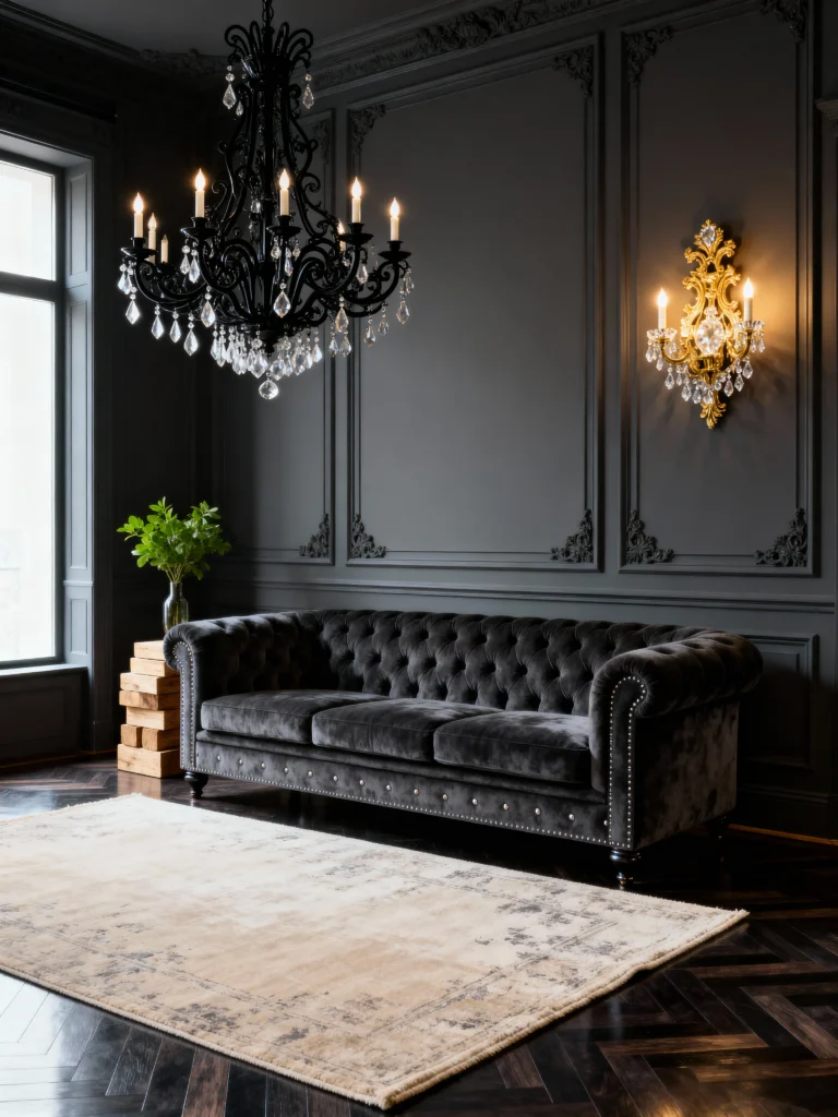 Ready to go dark? Paint your walls charcoal grey and add a black velvet sofa. Toss in grey cushions and a black chandelier—yes, a chandelier—for that gothic glam vibe. It’s dramatic, it’s intense, and it’s 100% awesome. I’d live here and channel my inner villain—cackling optional. This one’s for the bold souls out there.
