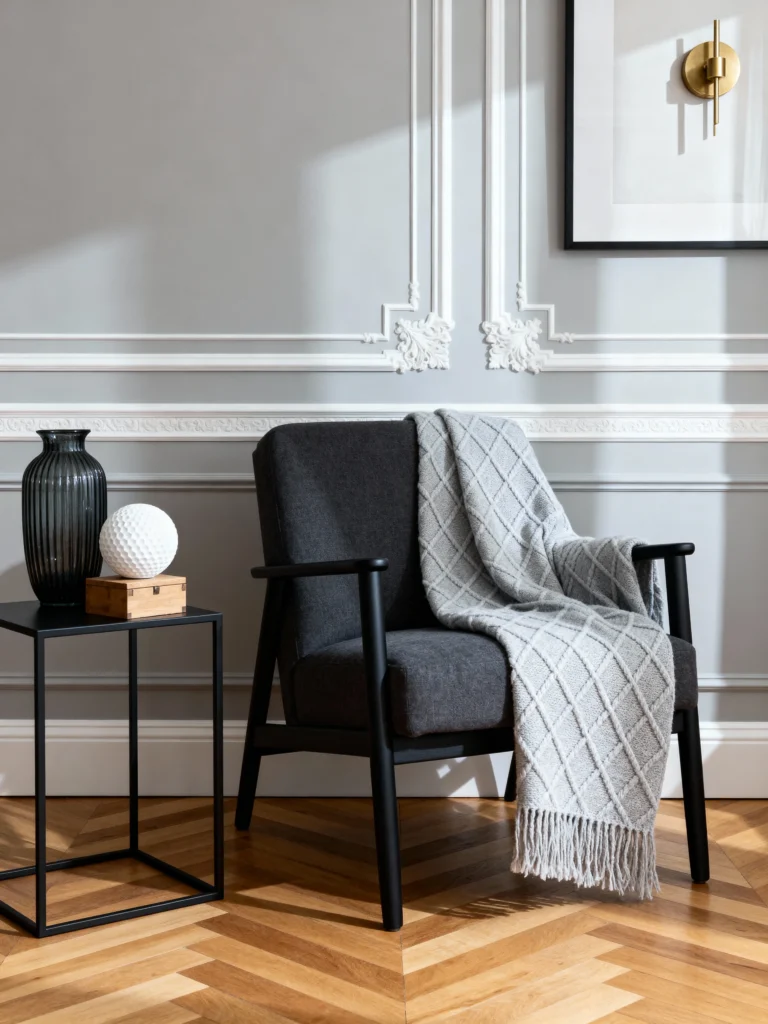 Channel that Scandinavian cool with light grey walls, a black accent chair, and minimal decor. Think clean lines, open space, and a “less is more” attitude. Add a grey wool blanket for warmth—I love this look so much, it hurts. It’s calm, it’s crisp, and it’s perfect for pretending you’re a minimalist guru. (Spoiler: I’m not, but I can fake it.)