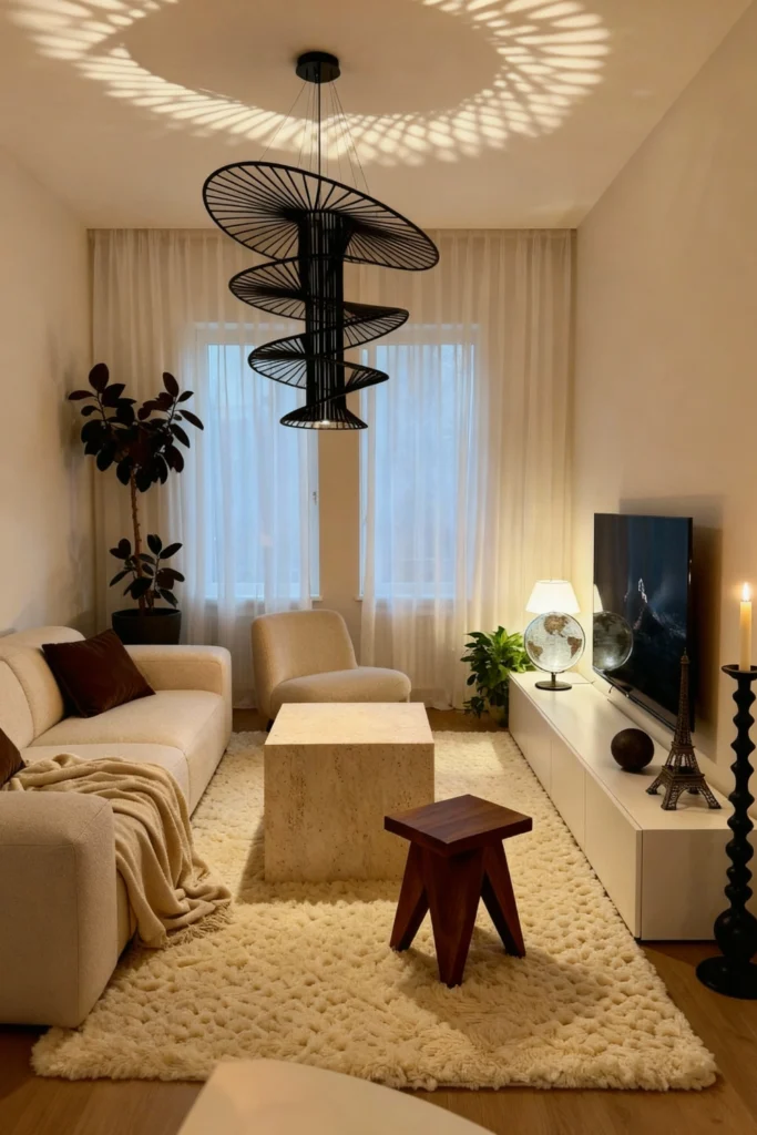 Want to make a statement? Start from the ceiling. A black, spiral-tiered chandelier creates incredible shadows and acts as a piece of art. Keep your furniture low-profile with a cream sectional and a blocky, stone-textured coffee table. Soften the sharp edges with a plush, high-pile rug and sheer white curtains. It’s a look that’s high-fashion but still feels like a place where you can actually kick back.