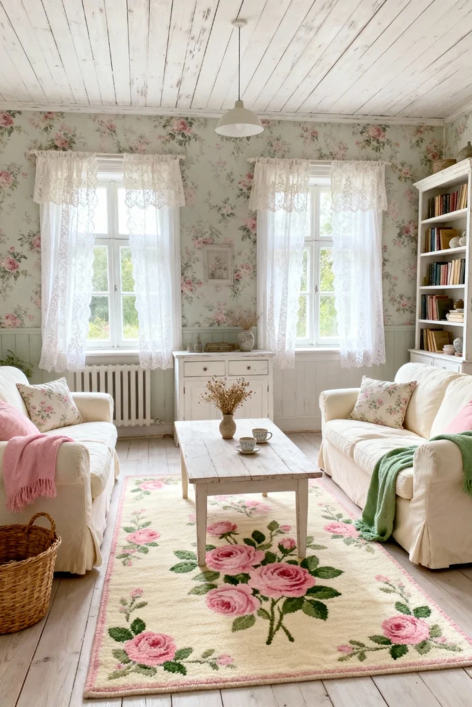 This is for the person who wants their home to feel like a permanent hug. Lean into the “shabby chic” look with floral wallpaper and a matching rose-patterned rug. Use slipcovered white sofas—they’re comfy and easy to clean! A distressed white wooden coffee table and lace curtains let the natural light filter in beautifully. It’s bright, airy, and perfectly nostalgic.