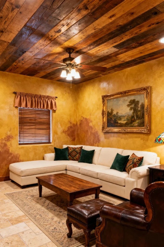 Bring the mountain lodge home. Start with a wood-paneled ceiling to immediately warm up the space. A large, off-white sectional provides plenty of seating, while emerald green velvet pillows add a touch of luxury. Pair this with a rich leather armchair and a classic landscape painting in a heavy gold frame. It’s the perfect setting for a glass of wine by an imaginary fireplace.