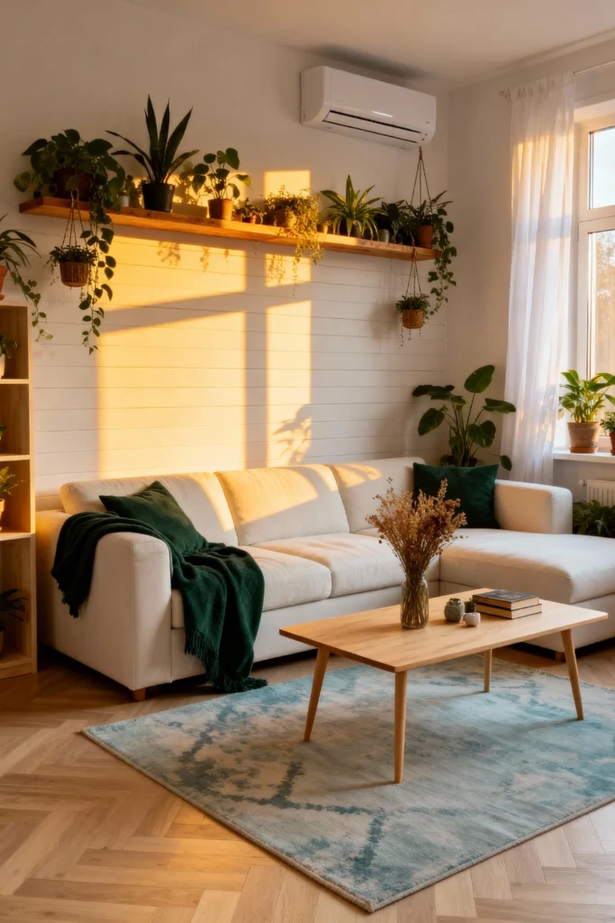 Love plants? This one’s for you. Install a long, natural wood shelf high on the wall to display a “jungle” of trailing vines and potted greens. A simple white sectional and a light oak coffee table keep the focus on the greenery. Opt for a cool blue-toned rug to balance the warm sunlight streaming through the windows. It’s fresh, organic, and totally breathable.