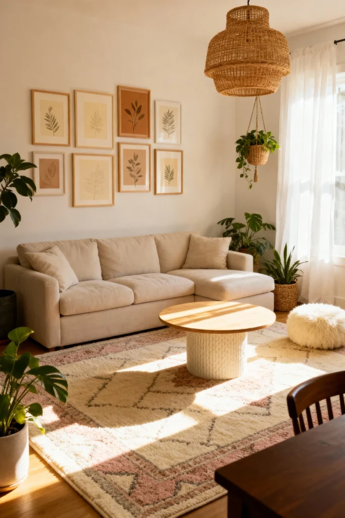 Create a space that feels curated and lived-in. Hang a large, tiered rattan pendant light to add texture. On the walls, a gallery of botanical prints in light wood frames pulls the nature theme together. Use a round, white-base coffee table to encourage flow in the room. A pink-accented geometric rug adds just enough color to keep things playful but sophisticated.