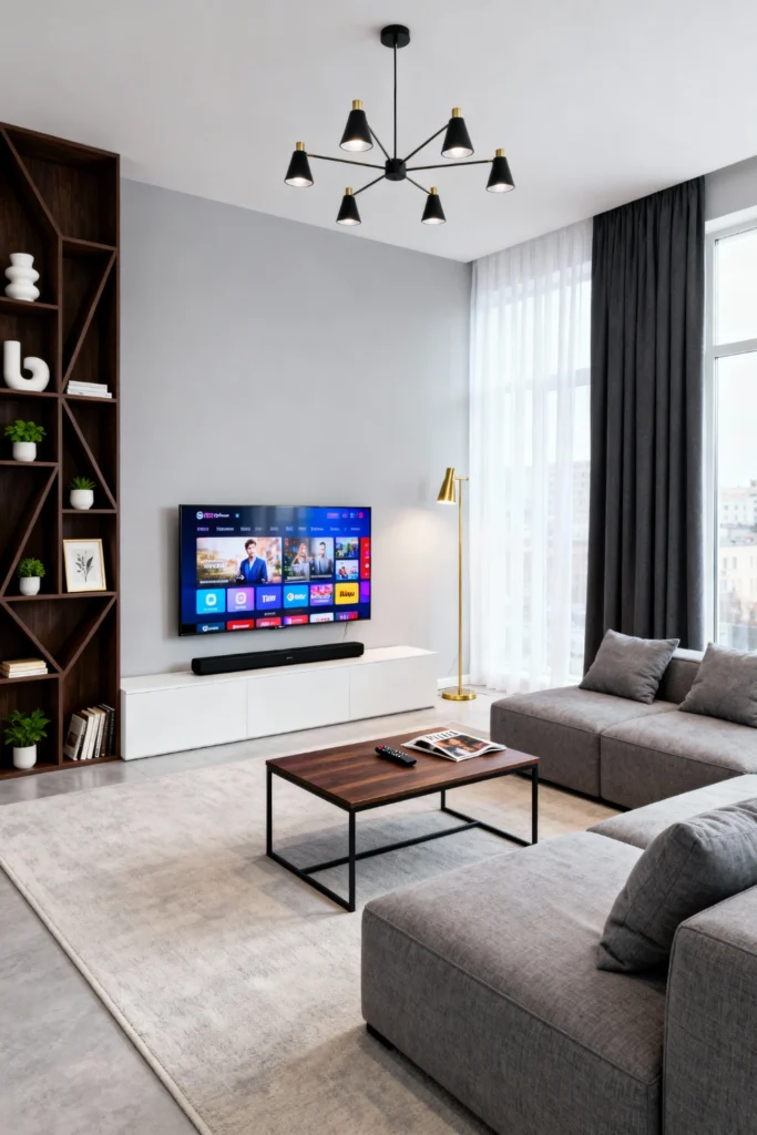 Keep it clean and focused. A grey, low-slung modular sofa is the anchor here. Choose a coffee table with a thin black metal frame and a dark wood top to mirror a geometric bookshelf. A multi-arm “spider” chandelier in matte black keeps the ceiling interesting without feeling cluttered. This style is all about “less is more,” giving your mind plenty of room to relax.