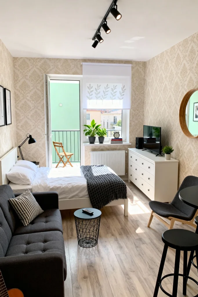 Small space? No problem. Use a light, damask-patterned wallpaper to add depth without closing the room in. A dark grey loveseat offers a cozy spot to sit, while a white dresser doubles as a TV stand and storage. Pro tip: hang a round mirror to reflect light and make the room feel twice as big. It’s a masterclass in making every square inch count.