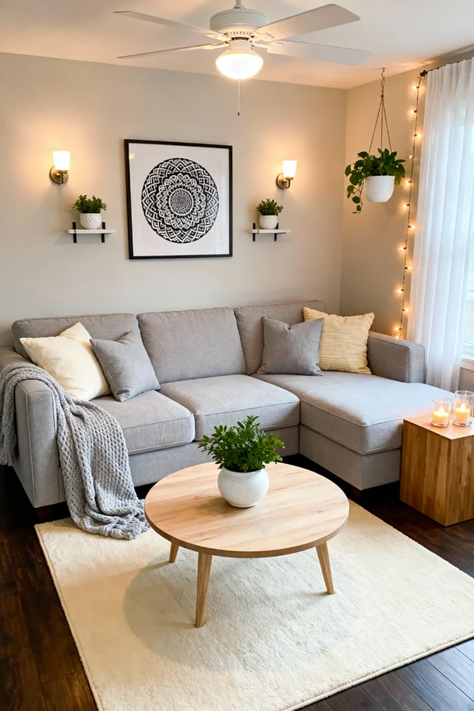 Warm lighting is the secret sauce here. Combine a central ceiling fan light with wall sconces and a string of fairy lights behind the curtains for a magical evening vibe. A grey L-shaped sofa and a round wooden table create a functional layout. Add a large mandala print as a focal point to give the room a centered, zen energy.