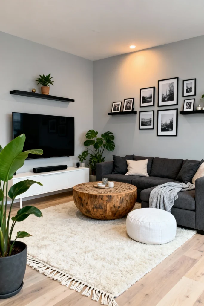Lean into the “Scandi” look with a grey and white palette. Mount your TV above a sleek white floating console to save floor space. Above the sofa, create a gallery wall using exclusively black and white photography in matching black frames. A raw, natural wood stump coffee table adds the perfect touch of “outside” to an otherwise polished, urban environment.