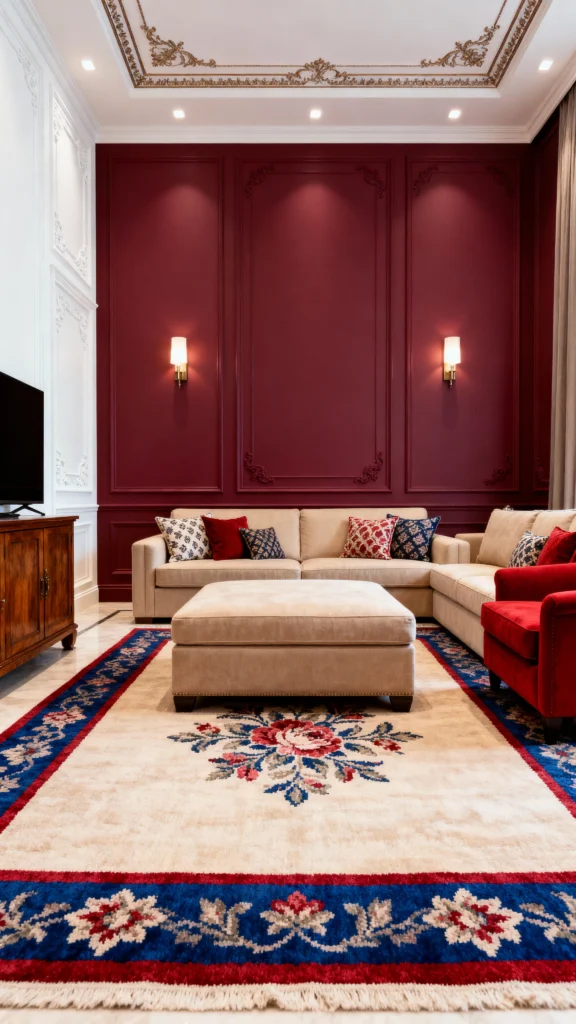 Accent walls in deep colors can really make a living room feel cozy. A rich maroon backdrop, for example, creates a warm and inviting atmosphere that draws people in. Pair it with soft furnishings and warm lighting, and you’ve got a space perfect for relaxation and connection.