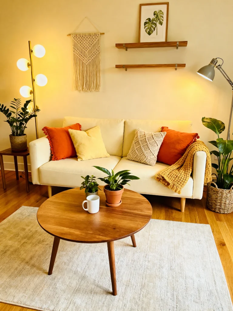 Using warm colors with neutral tones creates a cozy vibe in your living room. Shades of orange and soft yellows blend beautifully with beige and cream, making the space inviting. Toss in some textured pillows and a warm rug to complete the look and feel right at home.