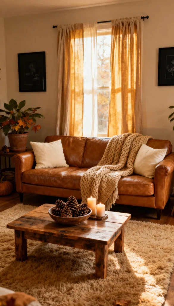 Choose a warm, caramel-colored leather sofa that invites you to sink right in. Drape a chunky, oversized beige knit blanket over the side for immediate texture. Place a rustic, reclaimed wood coffee table on top of a high-pile shag rug to keep things cozy. Decorate with a simple wooden bowl filled with pinecones. Light a few pillar candles near the window to capture that golden, late-afternoon vibe perfectly.