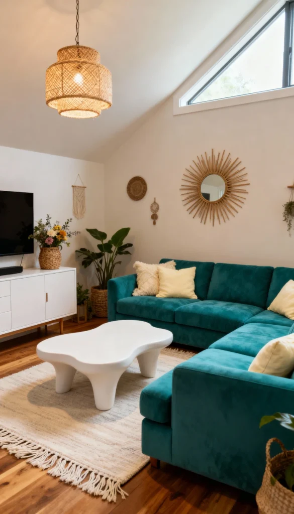 Go bold with a vibrant teal velvet sectional to serve as the room’s focal point. Balance the color with a playful, organic-shaped white coffee table. Hang a rattan sunburst mirror and macramé wall art to add natural, bohemian texture to the walls. Suspend a woven basket pendant light overhead to cast warm shadows. Incorporate plenty of leafy green plants in woven baskets to bring life into every corner.