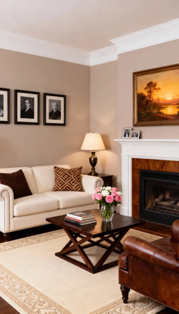 Start with a crisp, cream-colored loveseat to anchor the room brightly. Add deep chocolate brown velvet pillows for a sophisticated contrast. Hang three black-and-white portraits in matching black frames to create a balanced, personal gallery wall. Center a dark wood coffee table to ground the lighter tones of the rug. Finish the look by placing a clear glass vase with fresh pink roses right in the middle for a soft, welcoming touch.