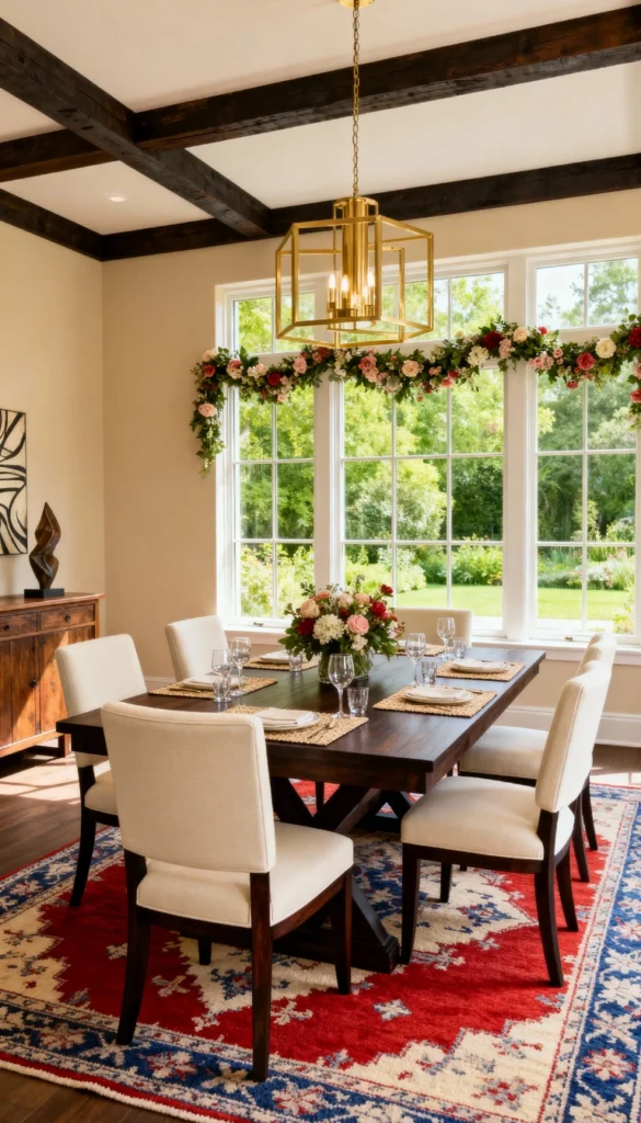 Center a solid dark wood farmhouse table to anchor the dining space. Drape a lush floral garland across the top of the window frame for a festive, garden-party feel indoors. Hang a large, geometric brass lantern to draw the eye upward. Lay down a vibrant red and blue patterned rug to make your cream upholstered chairs pop. Set the table with woven placemats for a touch of rustic charm.