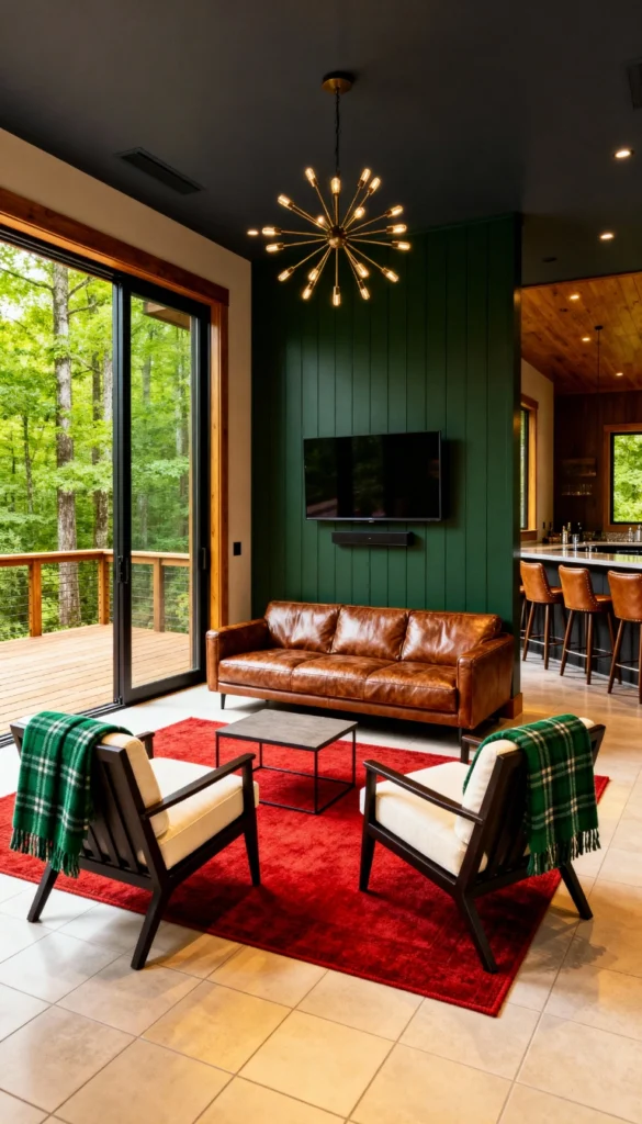 Install a dark green vertical shiplap wall to mirror the forest views outside. Contrast the dark wall with a sleek, mid-century cognac leather sofa. Hang a striking brass sputnik chandelier to add a modern, geometric edge. Use a bold red area rug to define the living space against the cool tile floors. Keep the window treatments minimal so nothing obstructs that incredible connection to nature.