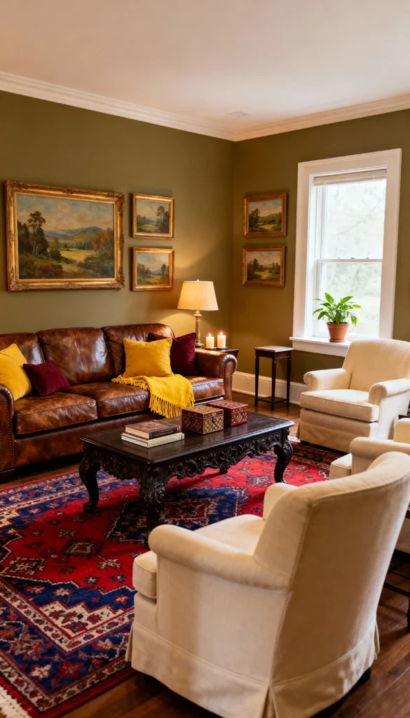 Paint your walls a deep, moody olive green to create a cozy, library-like atmosphere. Roll out a rich red and blue oriental rug to add pattern and history to the floor. Arrange vintage landscape oil paintings in ornate gold frames for a collected look. Mix a distressed brown leather sofa with cream wingback chairs to balance masculine and feminine elements. Place a small potted plant on the sill for freshness.
