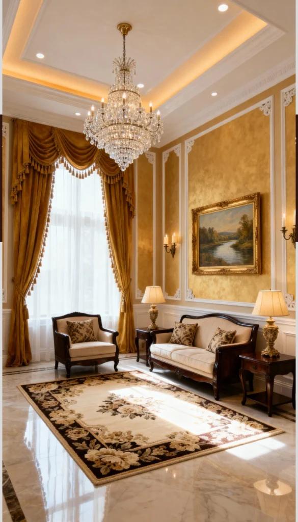 Indulge in luxury with textured gold wallpaper framed by white molding. Hang a massive, tiered crystal chandelier to act as the crown jewel of the room. Drape heavy, golden velvet curtains with tassels for a truly theatrical window treatment. Select vintage-inspired furniture with dark wood trim and curved lines. Place a traditional floral rug over polished marble floors to complete this grand, formal aesthetic.