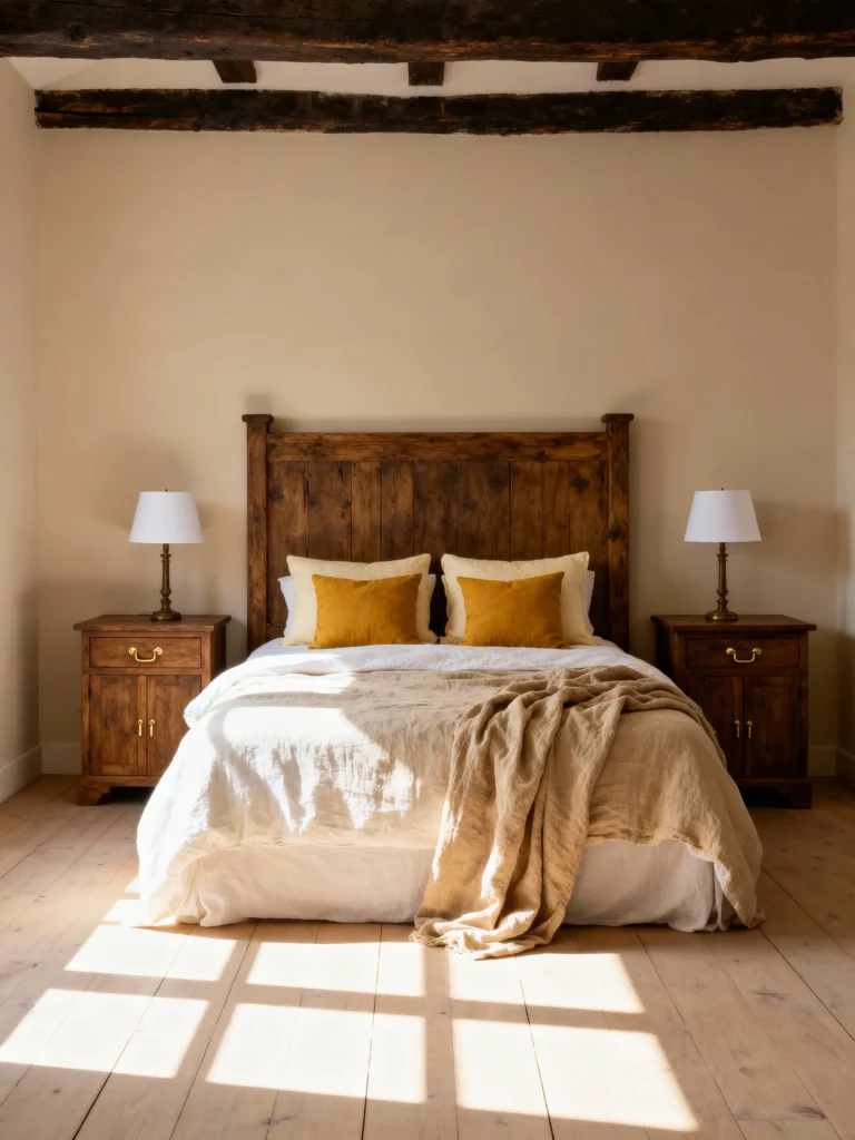 Source a reclaimed wood headboard with visible grain and knots for immediate character and history. Keep the walls a creamy, plaster-like off-white to let the wood stand out. Use antique wooden nightstands with brass hardware to match the rustic, farmhouse vibe. Dress the bed in heavy, natural linen sheets in muted earth tones for breathable comfort. Throw a raw-hemmed beige linen blanket across the bed. Leave the ceiling beams exposed to complete that timeless, sanctuary feel.