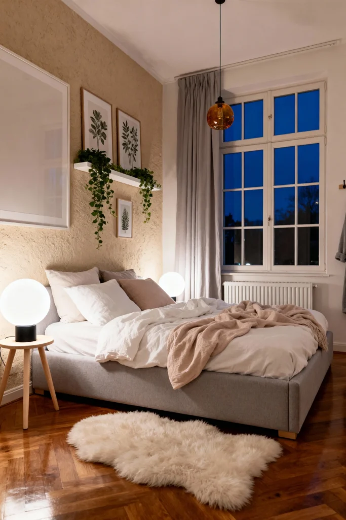 Apply a textured plaster finish to your feature wall in a warm, sandy beige tone. Install a floating white shelf high up on the wall and fill it with cascading ivy and potted plants to bring nature indoors. Select a low-profile grey upholstered bed for a modern, grounding element. Place large, frosted spherical table lamps on simple wooden stools to create soft, diffused light. Hang a single amber glass pendant light near the window to draw the eye upward and add a pop of warm color against the blue evening light.