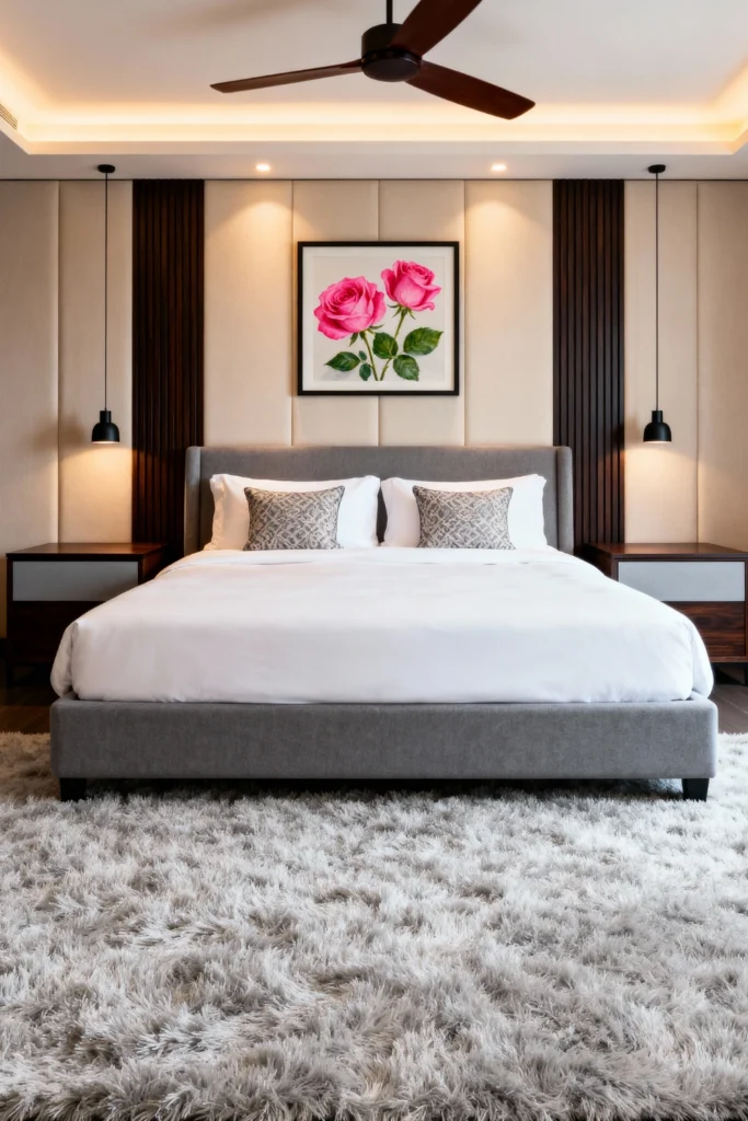 Install vertical wood slat paneling on a beige upholstered feature wall to create depth and architectural interest. Center a bold, framed botanical artwork—like bright pink roses—to act as the room’s sophisticated focal point. Choose a streamlined grey bed frame with a tall, structured headboard. Place identical dark wood nightstands on either side, with sleek black pendant lights hanging directly above them for symmetry. Lay down a massive, high-pile silver rug to add instant texture and that walking-on-a-cloud feeling.
