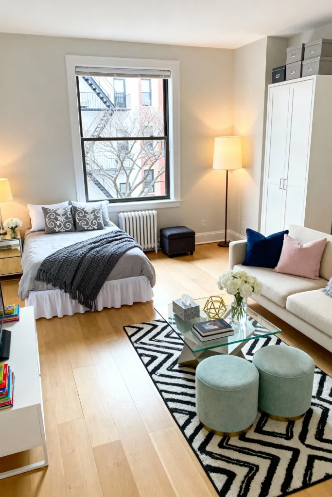 Opt for a daybed setup with a ruffled grey skirt to allow the room to double as a lounge during the day. Layer a bold, black-and-white geometric rug to define the seating area and add visual energy. Introduce a glass-topped coffee table to keep the visual space open and airy. Add velvet ottomans in soft sage green for flexible, movable seating. Keep your storage vertical with a tall white wardrobe, topping it with matching grey storage boxes for a clutter-free, organized aesthetic.