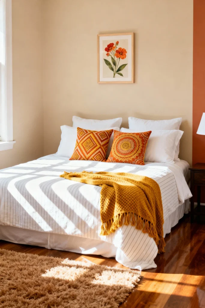 Paint a feature wall in a burnt orange or terracotta hue to warm up the space instantly. Dress the bed in crisp white linens, then layer on vibrant orange throw pillows with intricate mandala patterns. Drape a chunky, mustard-yellow knit blanket casually over the foot of the bed for texture. Keep the furniture simple with dark wood side tables to let the colors shine. Let the natural sunlight do the work, highlighting the textures of a shaggy, caramel-colored area rug at the foot of the bed.