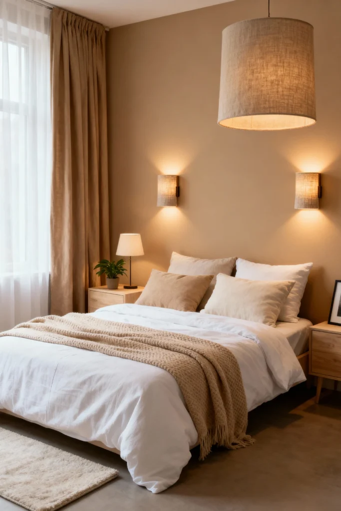 Stick to a strict monochromatic palette of oatmeal, beige, and sand for a calming effect. Install fabric wall sconces that cast a warm up-and-down glow instead of using harsh overhead lighting. Layering is key here: combine a white linen duvet with a waffle-knit throw blanket in a slightly darker tan. Hang floor-to-ceiling beige linen curtains to soften the window frame and filter the light. Keep the bedside tables minimal and light wood to maintain that airy, uncluttered, and zen-like atmosphere.