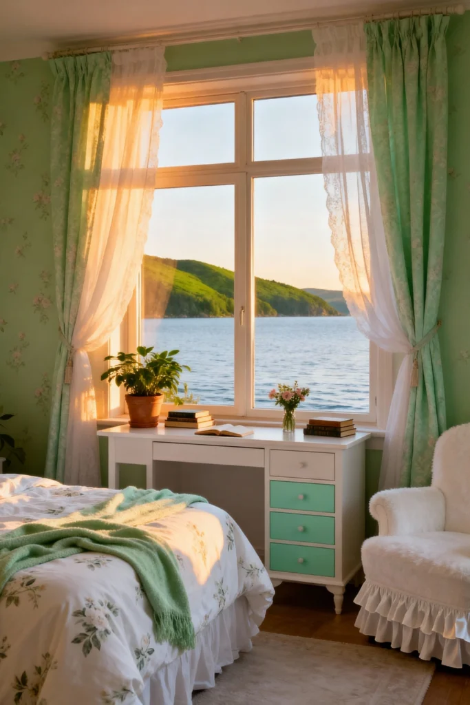Frame your window with sheer, mint-green curtains that pool slightly on the floor for a romantic touch. Position a white vintage vanity desk with pastel green drawers directly in front of the window to capture the view. Use a plush, white skirted armchair to add a sense of vintage luxury. Dress the bed in soft floral print bedding and toss a sage green knitted blanket on top. Let the golden hour light flood in to emphasize the cozy, storybook aesthetic and the connection to the outdoors.
