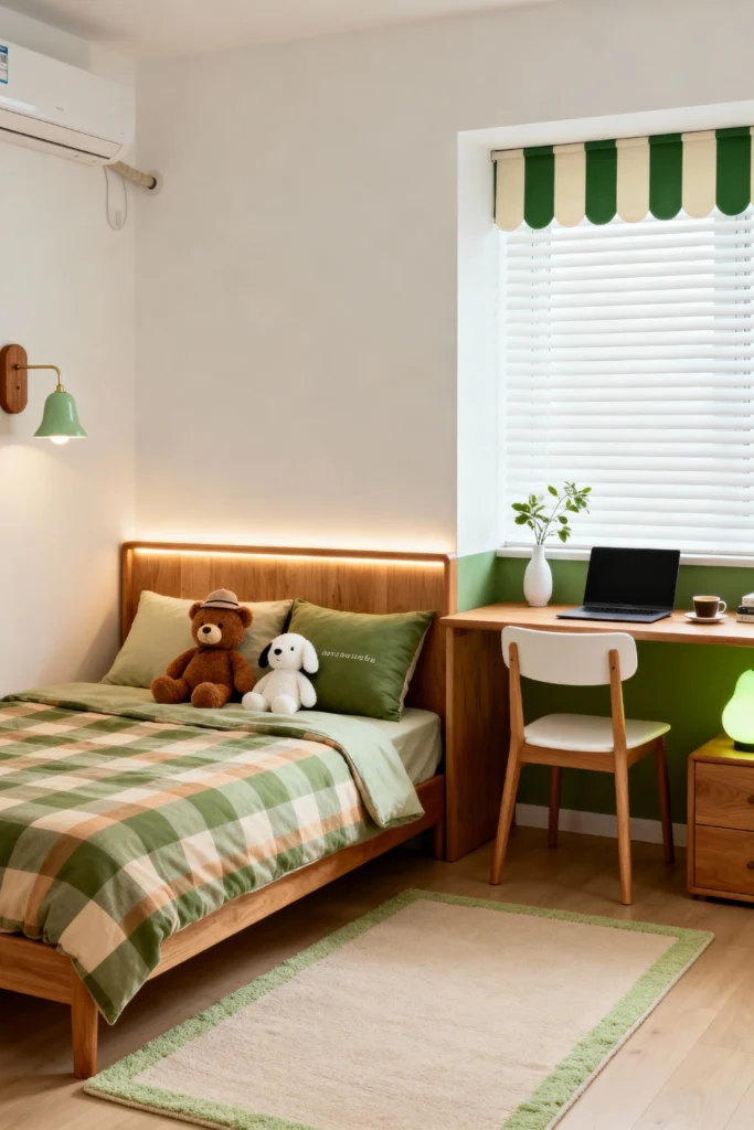 Create a color-blocked wall with fresh white on top and grass green on the bottom to ground the space. Install a custom striped valance box above the blinds for a fun, retro awning effect. Choose a solid wood bed frame that features a built-in LED warm light strip in the headboard. Quirky details matter: add a green pear-shaped lamp on the nightstand and arrange plush toys on the bed. Use a checkered green and beige duvet cover to tie the whole nature-inspired theme together.
