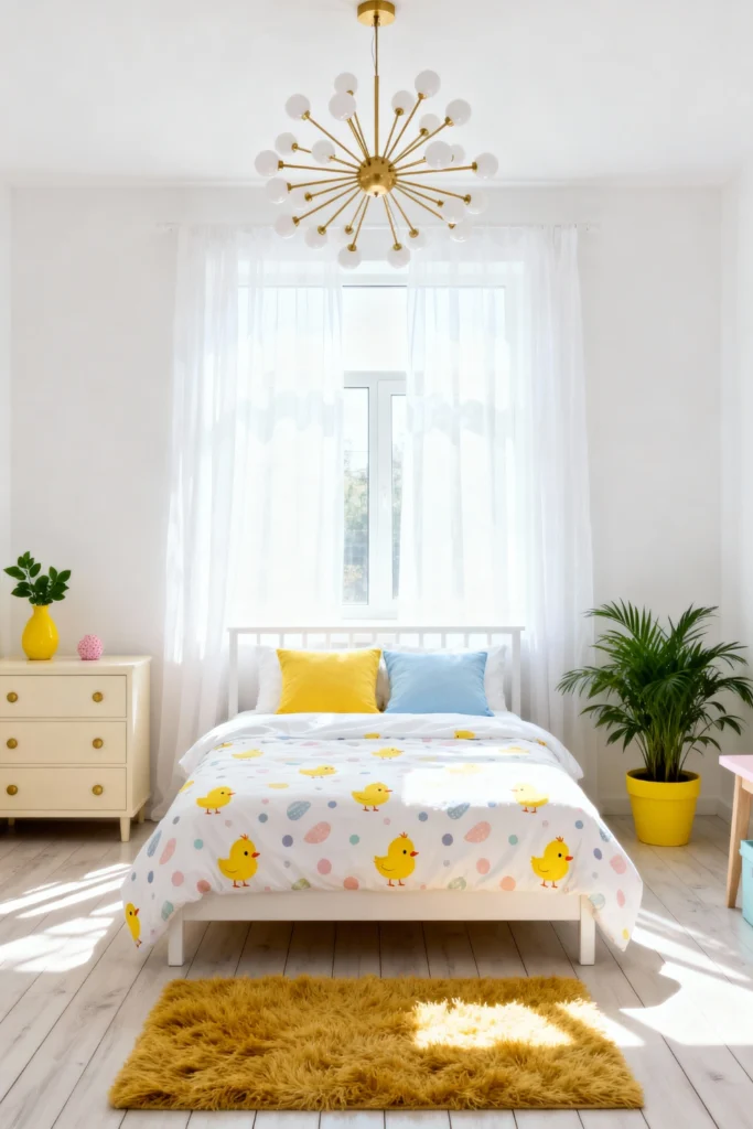 Anchor the room with a playful, gold sputnik chandelier for a burst of mid-century energy. Paint the walls stark white to make the colorful accents truly pop. Choose bedding with a cute, repeated motif—like little yellow chicks—for a whimsical, happy touch. Place a large potted palm in a bright yellow pot to bring vibrant life to the corner. Finish the look with a textured, mustard-yellow shag rug to warm up the white floorboards and create a cozy play area.