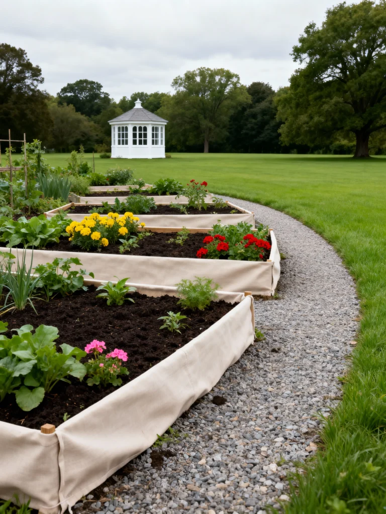 Install rectangular raised beds with clean canvas or fabric sides for a tidy, organized vegetable plot. Fill them with nutrient-rich soil and plant rows of leafy greens alongside bright marigolds for natural pest control. Lay down crushed grey gravel between the beds for a satisfying crunch underfoot and excellent drainage. Position a classic white gazebo in the distance to act as a charming focal point and a place to rest.