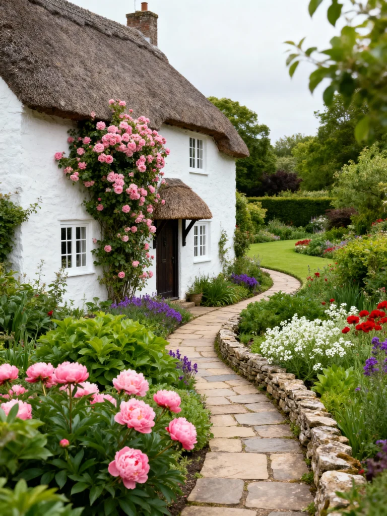 Plant climbing pink roses against a whitewashed wall to create vertical drama and old-world romance. Let lush pink peonies spill over the edges of a winding, irregular flagstone path to soften the hardscaping. Add a rustic thatched-style roof or textured shingles to ground the fairytale aesthetic. Keep the surrounding greenery slightly wild and unkempt for that authentic English countryside feel. Use white window frames to make the greenery pop.