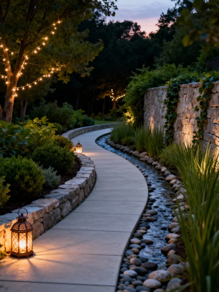 Construct a rugged stone retaining wall to guide the eye along a curved path. Dig a narrow, stone-lined canal alongside the walkway to introduce the soothing sound of running water. String warm fairy lights in the trees above to create a magical, glittering canopy. Place metal lanterns on the ground to cast soft shadows and illuminate the smooth concrete pavers for a moody, inviting evening atmosphere.