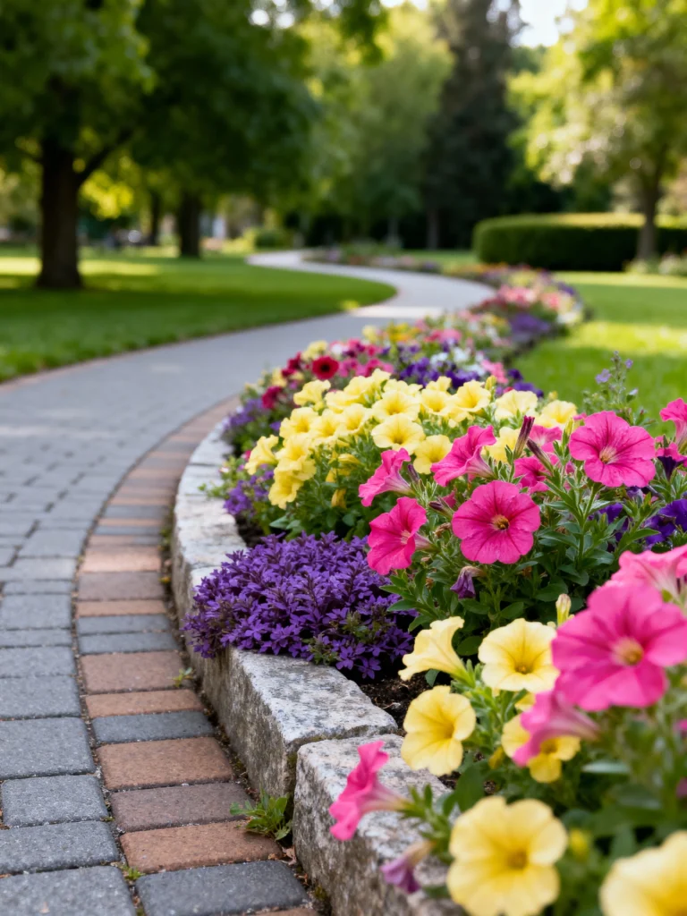 Border a winding paver walkway with a low, rough-hewn stone curb to guide the eye. Pack the edge with a vibrant mix of pink, yellow, and purple petunias for a continuous, flowing ribbon of color. Let the flowers spill slightly over the stones to soften the transition between the path and the soil. Keep the background lawn expansive and green to let this colorful, low-growing border take center stage.