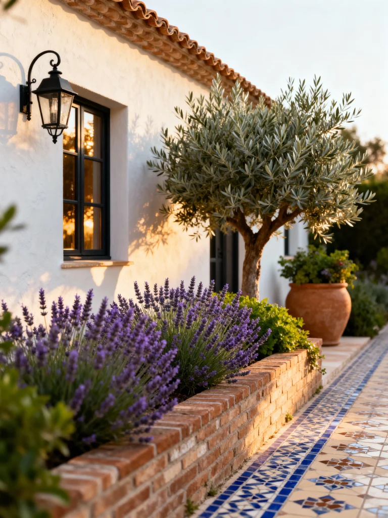 Anchor the space with a gnarled olive tree near a white stucco wall to capture that southern European light. Plant rows of fragrant lavender in a raised brick bed to add purple hues against the warm terracotta tones. Place a large, unglazed clay urn nearby for added texture and height. Lay down intricate blue and white patterned tiles to bring a vibrant, coastal Spanish flair to your patio floor.