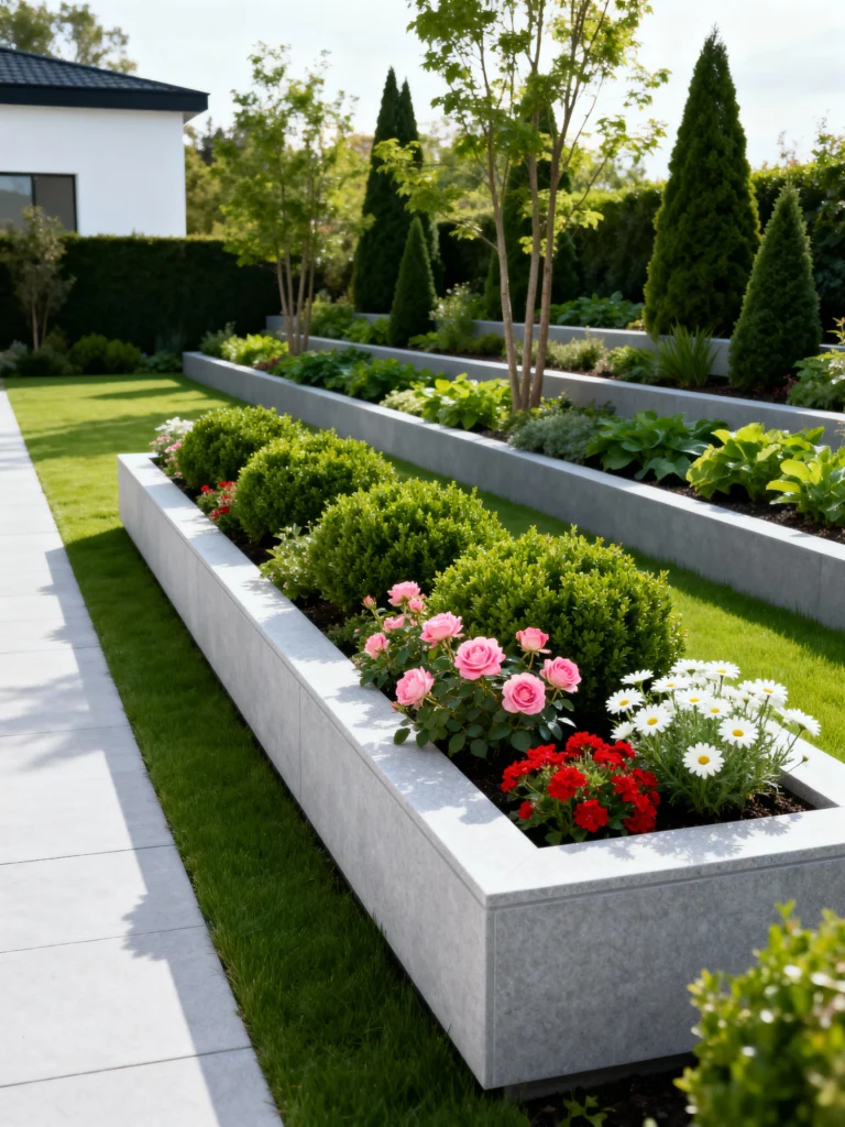 Build tiered, rectangular concrete planters to create distinct, architectural levels in the garden. Fill them with perfectly spherical, manicured boxwoods to establish a sense of order and structure. Add pops of pink roses and red bedding flowers between the greenery to soften the sharp grey edges. Lay down large, smooth white pavers for a clean, minimalist walkway that contrasts sharply with the deep green, manicured grass.