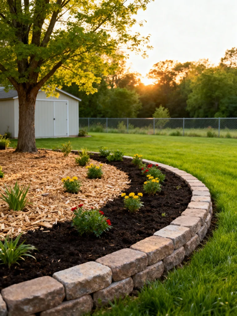Create a defined curve around a large shade tree using stacked, tumbled stone blocks for a clean border. Fill the bed with fresh wood mulch to suppress weeds and retain moisture for the plants. Plant clusters of bright yellow and red marigolds for a cheerful, low-maintenance pop of color. Keep the surrounding lawn freshly mowed to emphasize the satisfying separation between the lush grass and the garden bed.