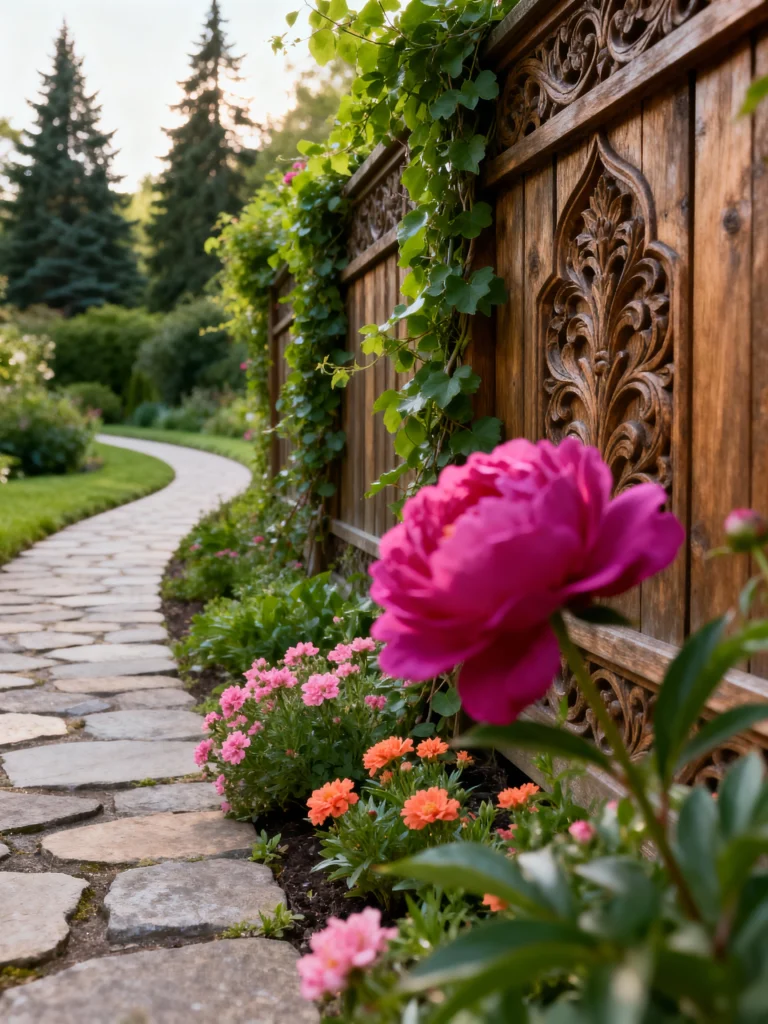 Install a handcrafted wooden fence with intricate floral carvings to provide privacy with artistic personality. Allow green vines to creep over the top rail to blend the wood structure back into nature. Lay a flagstone path with wide gaps to create a natural, aged look. Plant bright pink peonies and low-growing coral flowers at the base to frame the walkway with vibrant, eye-catching blooms.