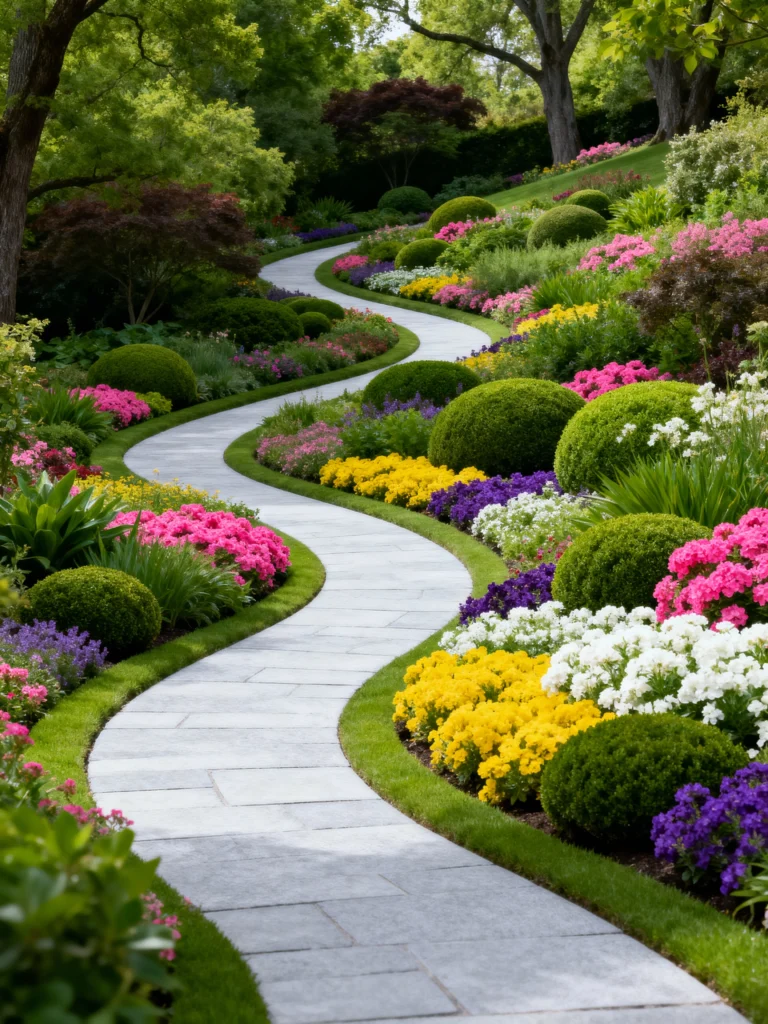 Design a long, serpentine path that disappears into the distance to create a sense of mystery. Flank the walkway with round, manicured green shrubs to provide rhythmic structure. Fill the spaces between the shrubs with drifts of yellow, white, and pink flowers to create a rolling tapestry of color. Use large, flat grey stones for the path to keep the look elegant and grounded amidst the explosion of blooms.