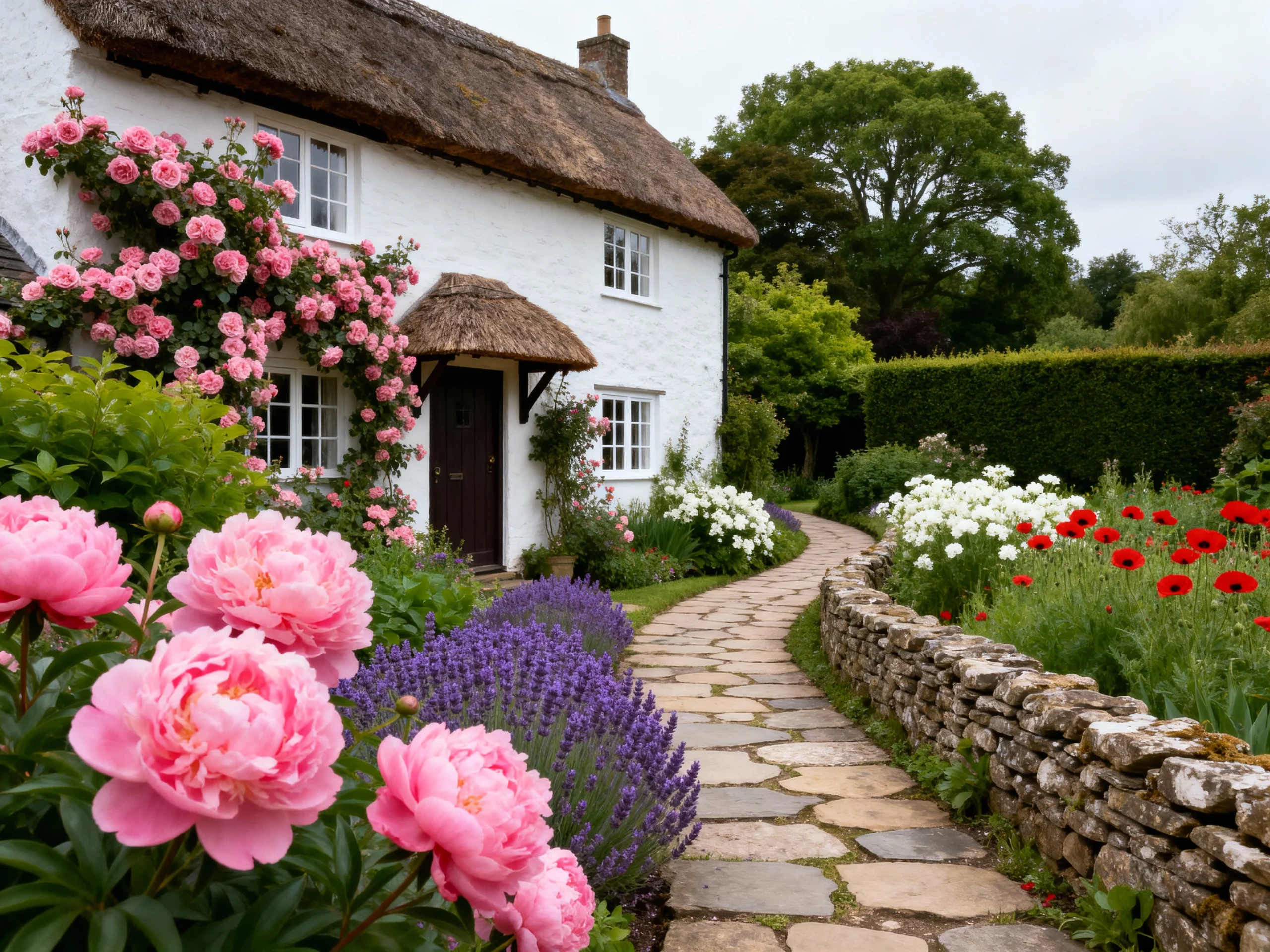 Plant climbing pink roses against a whitewashed wall to create vertical drama and old-world romance. Let lush pink peonies spill over the edges of a winding, irregular flagstone path to soften the hardscaping. Add a rustic thatched-style roof or textured shingles to ground the fairytale aesthetic. Keep the surrounding greenery slightly wild and unkempt for that authentic English countryside feel. Use white window frames to make the greenery pop.