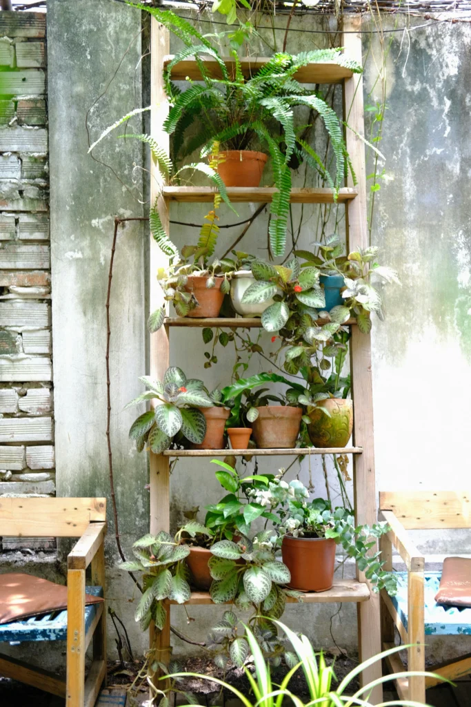 Take the intentional decor outside! An old wooden ladder repurposed as a plant stand is perfect for a courtyard or patio. Even with a dense collection of ferns and foliage, it feels organized because the ladder provides structured levels. The mix of weathered terracotta pots feels authentic and earthy. It’s a gorgeous, rustic focal point that celebrates nature’s beauty.