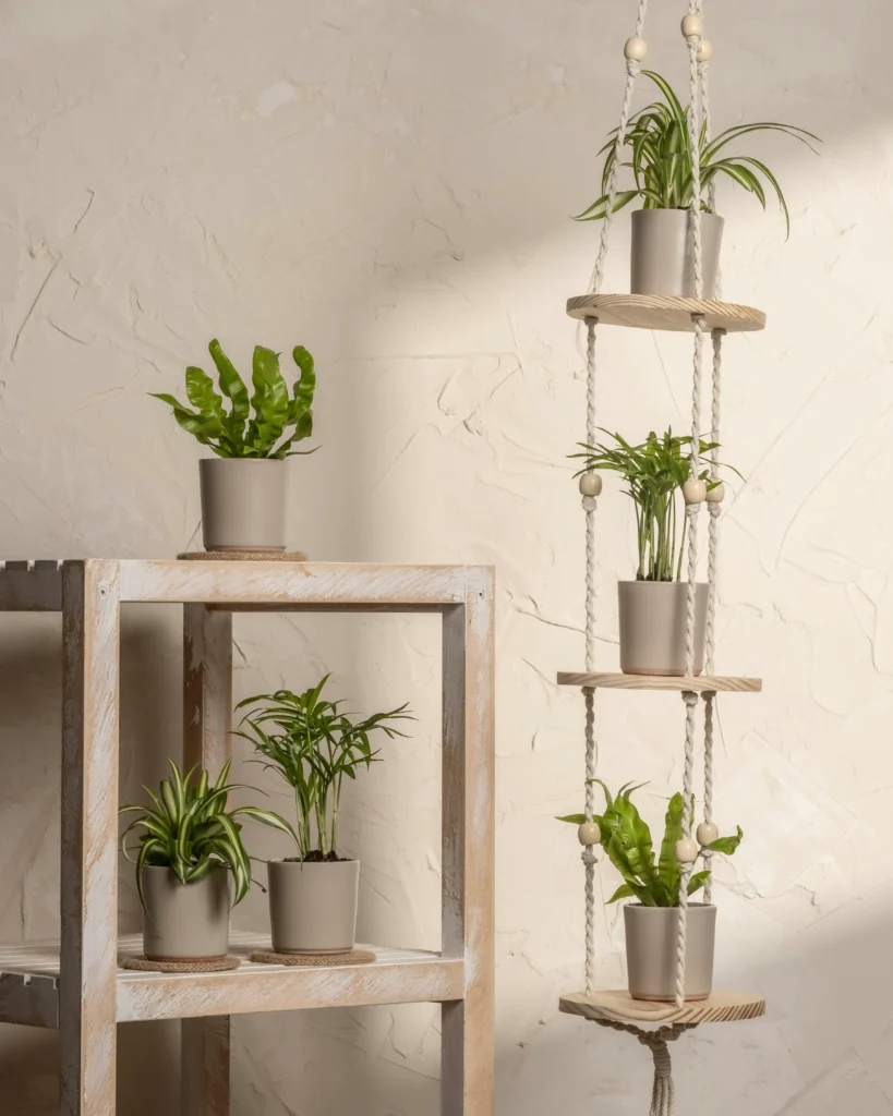 Combine different styles for a beautifully layered look. A distressed white shelf paired with a suspended rope hanger draws the eye upward and maximizes your vertical space. By sticking to matching soft beige pots across both stands, the entire arrangement feels cohesive and peaceful rather than busy. It’s a beautifully simple way to display smaller ferns and spider plants.