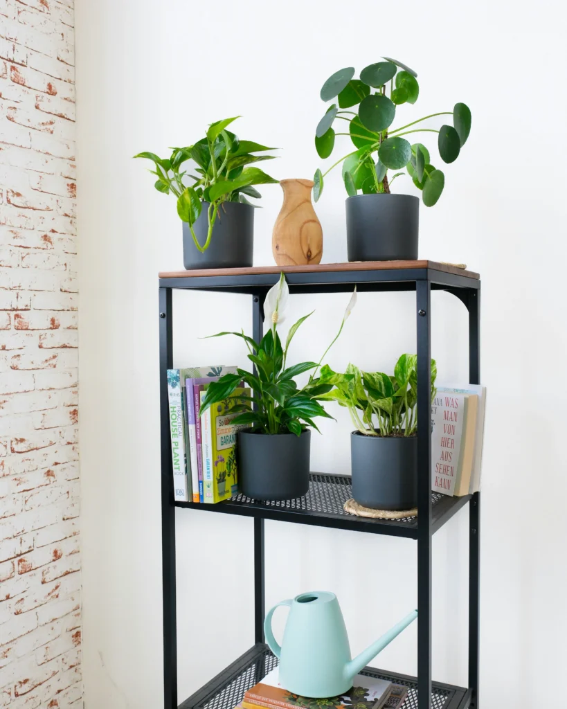 Mix functionality with greenery using a sleek black metal and wood shelving unit. This style allows you to blend your favorite reads with your plant collection naturally. The dark pots tie in perfectly with the black frame, creating a cohesive and striking look against a white brick wall. It’s an intentional, organized way to show off your plants.