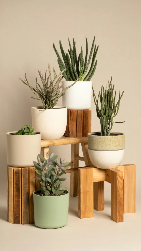 You can create a beautiful focal point by grouping your plants, but the trick is varying the heights. Using simple wooden stools and blocks alongside a cohesive palette of muted ceramic pots keeps the look incredibly tidy. This intentional arrangement turns a collection of distinct succulents and cacti into a unified, clean display that is totally free of clutter.