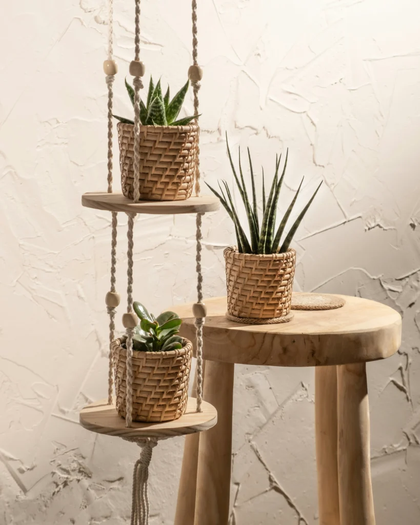 Don’t forget to look up! If surface space is tight, a hanging tiered rope shelf is a brilliant solution. Pair it with woven baskets to add warmth and cohesive texture to your decor. Sitting next to a raw wood stool, this setup feels earthy and authentic. Hanging displays keep your surfaces clean and clutter-free while turning your succulents into floating artwork.